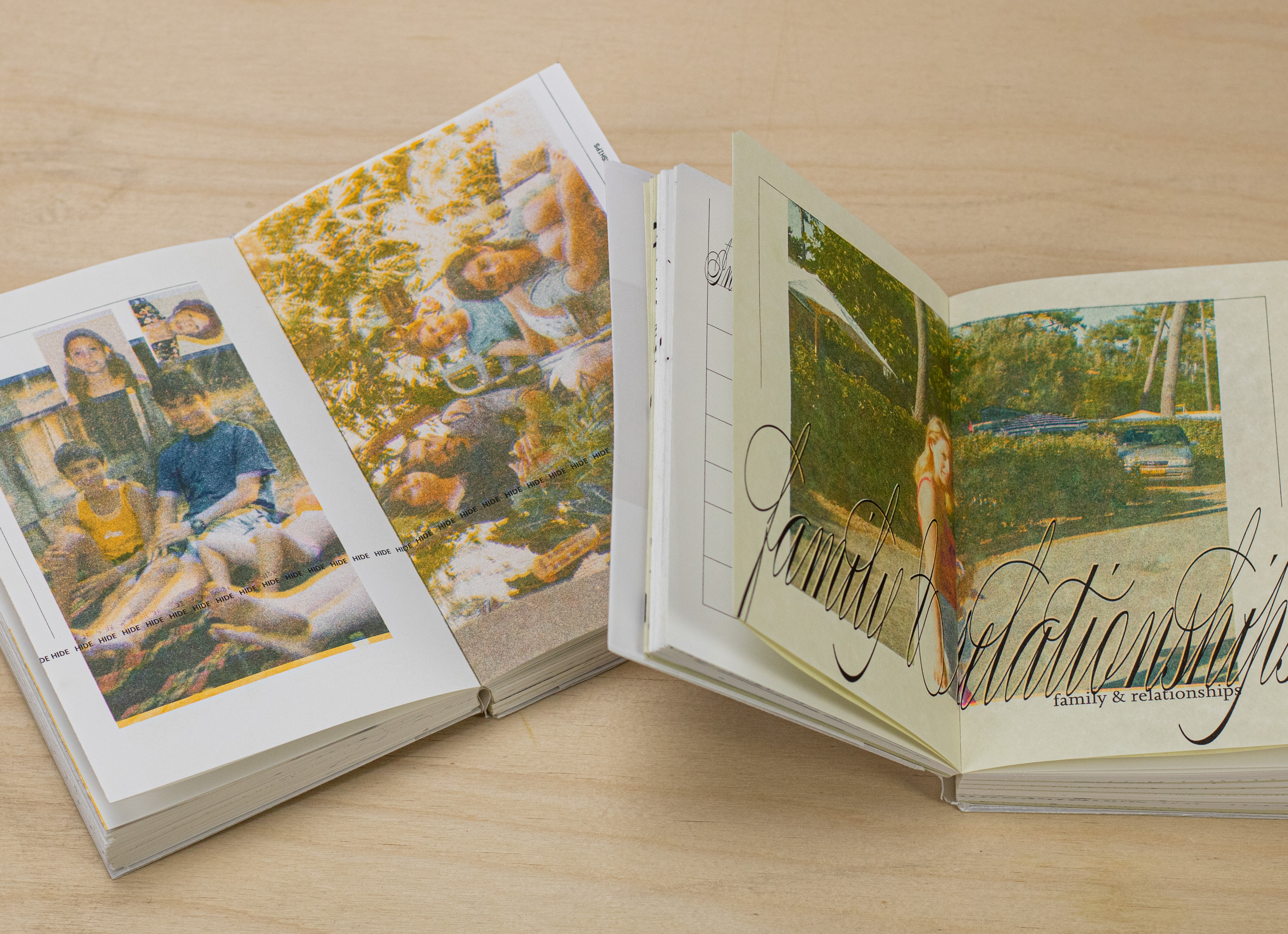 The book is printed using a risograph and a color palette of teal, fluorescent pink, sunflower, and black. The pages were then bound using a cold glue layflat method, and the final product is wrapped in a translucent jacket. Inside, the book features translucent paper.